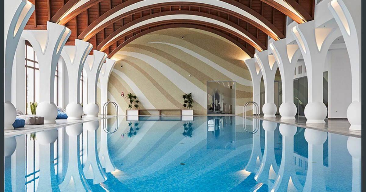 A hotel különleges, boltíves medencetere nem csupán fürdőzésre hív, hanem vizuálisan is lenyűgöz. A tér középpontja a harmonikus színekkel megalkotott mozaikburkolat, amely a víz tükrében hullámzó, természetet idéző formákkal válik teljessé. Ezt a látványt a Duocolor Mozaik Stúdió tervezte és kivitelezte: több ezer apró üvegdarab alkot tökéletes ívet, egységet, ritmust – mindezt úgy, hogy a természet ihlette színátmenetek nyugalmat árasztanak, mégis elegáns lendületet visznek a térbe.