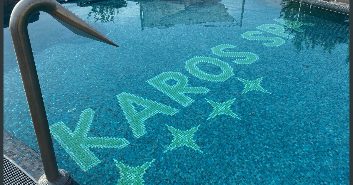 A kültéri medence egyik legfeltűnőbb eleme maga a mozaikkal kirakott „KAROS SPA” felirat és csillag motívum, amely nemcsak dekoratív, hanem már-már szimbólummá vált. A víz alatti csillogó grafika a Duocolor Mozaik Stúdió precíz munkáját dicséri, ahol a színek, formák és arányok tökéletesen illeszkednek a medencetér esztétikájába. A kékes-zöldes tónusok a természet vízivilágát idézik, és a medence tükrében napfényként játszanak, minden fürdőzést új élménnyé varázsolva.