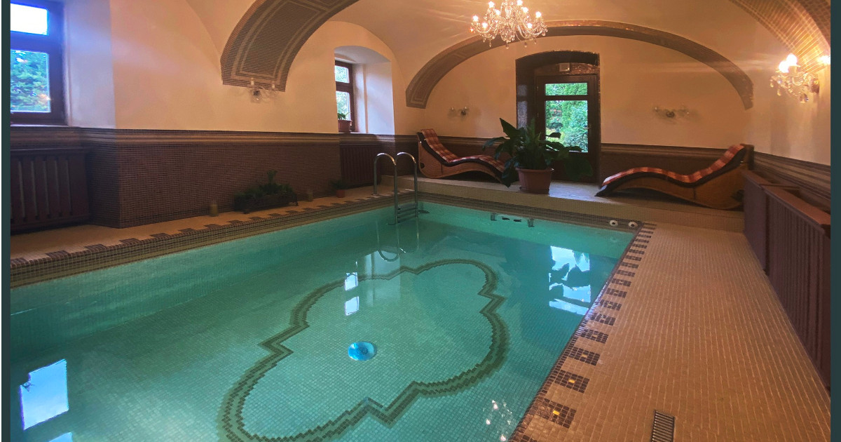 A beltéri medencetér minden részlete a kikapcsolódást szolgálja, de közben egy percre sem feledkezik meg az esztétikáról. A Duocolor Mozaik Stúdió által megálmodott, finoman ívelt díszmozaik a medence alján egyfajta vizuális ékszerként működik. A pasztelles bézs és zöld árnyalatok nem hivalkodnak, inkább elegánsan simulnak bele a klasszikus térbe, és a boltívek alatt különösen látványos fénymintákat tükröznek vissza.